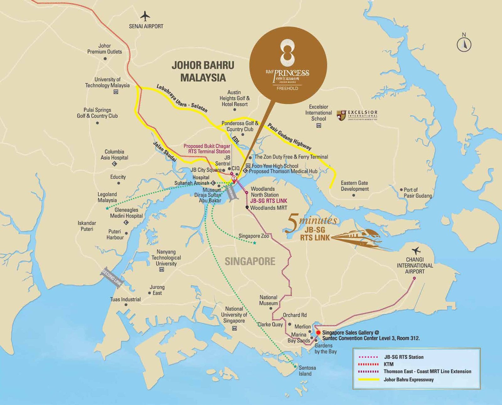 R&F Princess Cove is a landmark seafront township located just 1km from the Johor–Singapore Causeway, directly across from Woodlands Checkpoint. Positioned at the edge of Johor Bahru’s central business district, it offers direct access to CIQ, the upcoming RTS Link, and key urban infrastructure. Spanning over 440,000 square meters, this integrated development includes luxury residences, a five-star hotel, Grade-A office towers, a seafront commercial centre, international clubhouse, and landscaped waterfront promenades. With views of the Singapore skyline and a rare cross-border location, Princess Cove combines lifestyle, accessibility, and long-term value in one prestigious address.